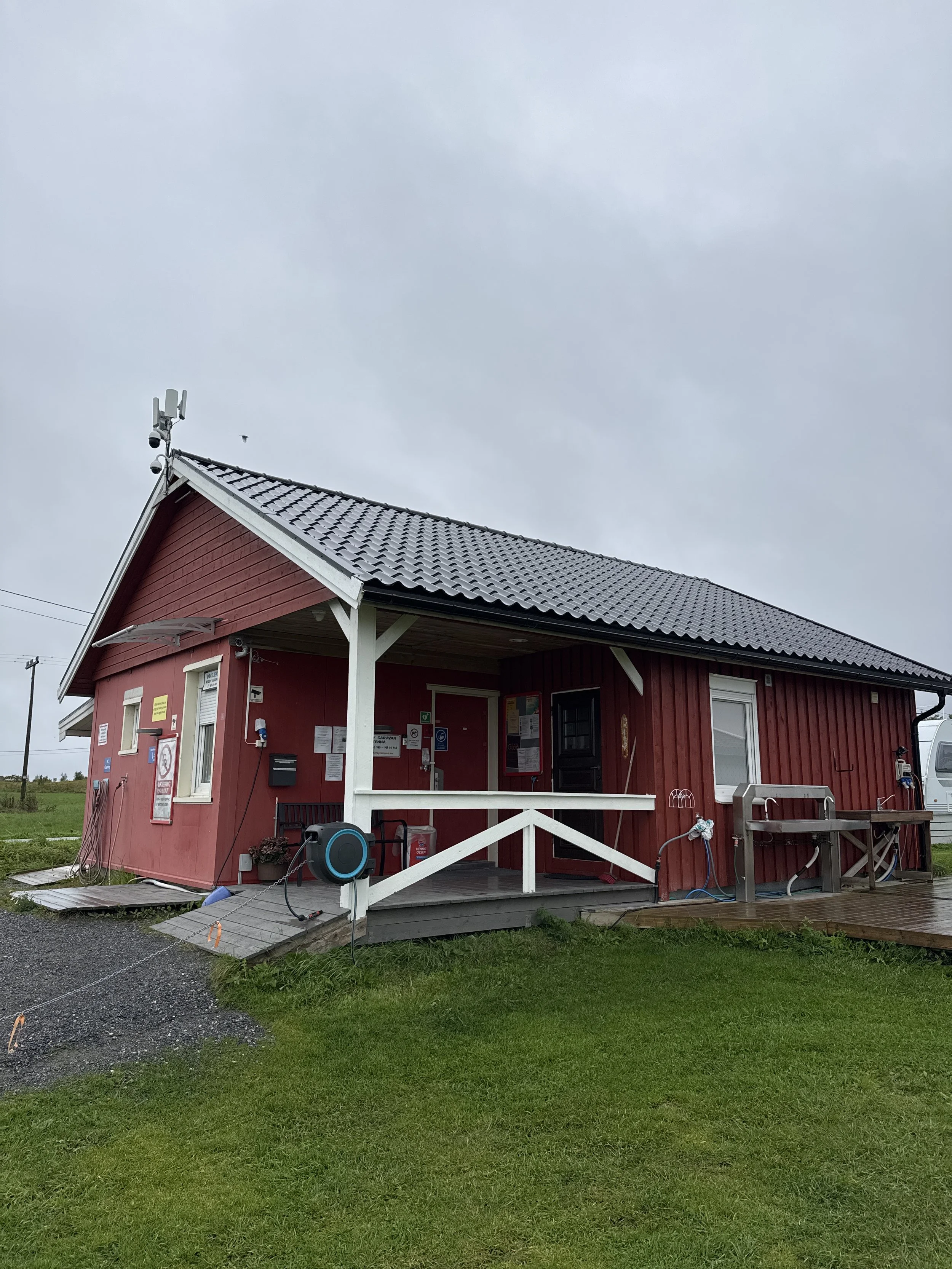 Toalettet får dere på venstre siden ved parkeringsplassen. Det er et stort rødt service bygg, nøkkel brikken henger inne i badstuen. Når dere kommer inn i service bygget så er dametoalettet rett frem og herretoalettet til høyre. Dusjen er ved siden av badstuen, du vil se denne når du sitter inne og ser ut. Du slår den på ved å vende om en liten rød ventil.
